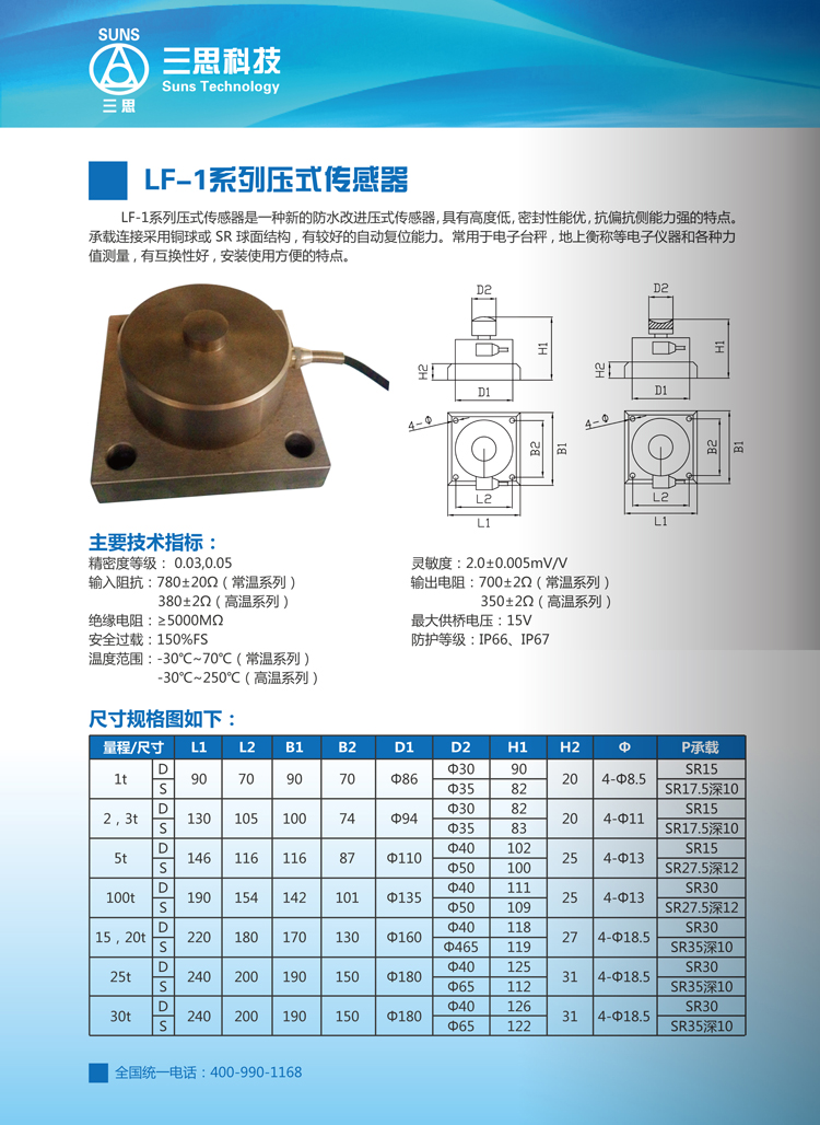 產(chǎn)品詳情 功能介紹 產(chǎn)品優(yōu)勢 參數(shù)/型號 包裝清單 產(chǎn)品詳情 LF-1系列壓式傳感器是一種新的防水改進壓式傳感器,具有高度低、密封性能優(yōu)、抗偏抗側(cè)能力強的特點。承載連接采用銅球或SR球面結(jié)構(gòu),有較好的自動復位能力。常用于電子臺秤、地上衡稱等電子儀器和各種力值測量,有互換性好、安裝使用方便的特點。 功能介紹 產(chǎn)品優(yōu)勢 參數(shù)/型號 包裝清單